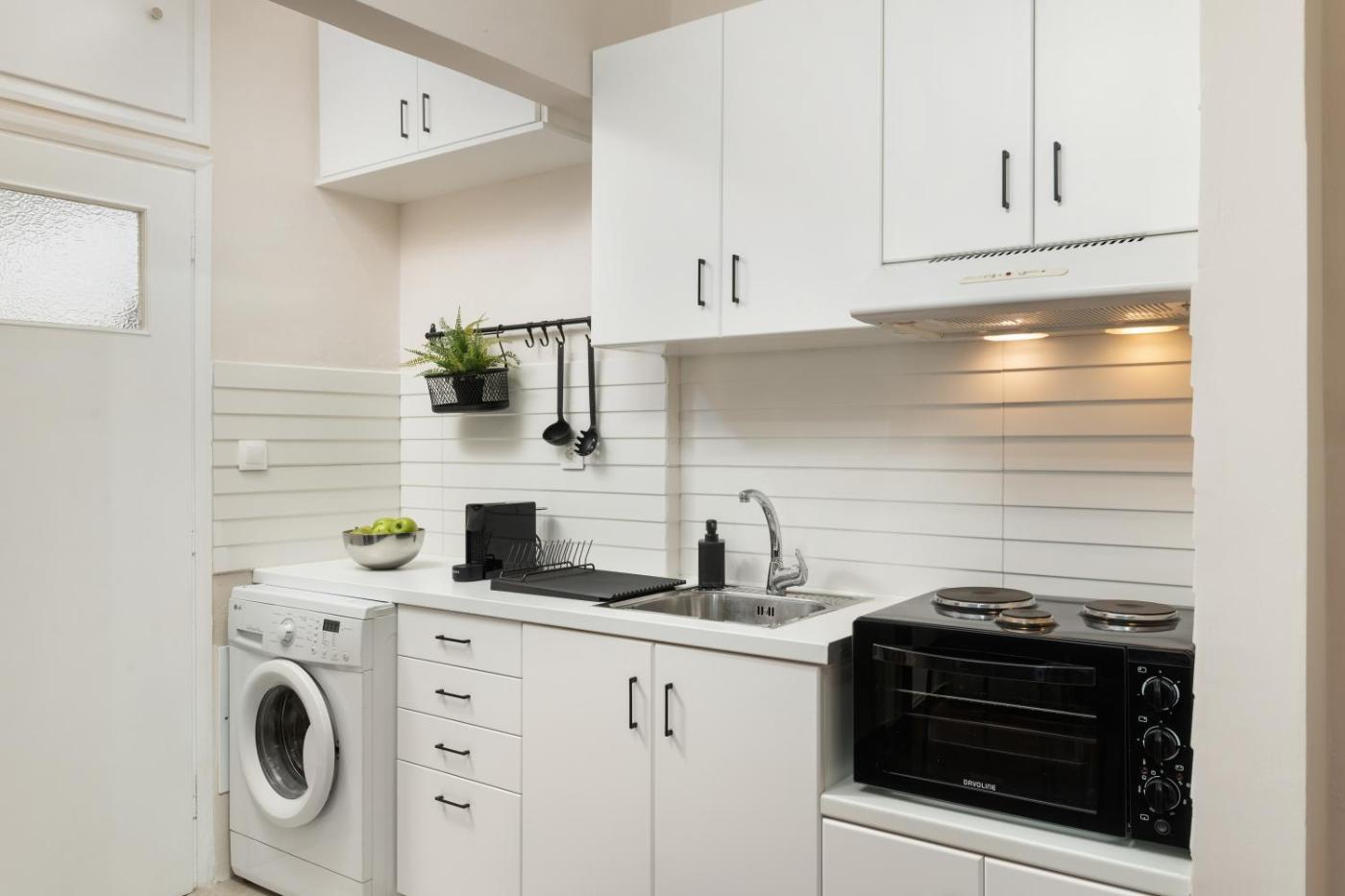 One-Bedroom Apartment. This apartment is comprised of 1 living room, 1 separate bedroom and 1 bathroom with a walk-in shower and free toiletries. The apartments kitchenette, which has a refrigerator and kitchenware, is available for cooking and storing food. This apartment is air-conditioned and features a seating area with a flat-screen TV, a washing machine, soundproof walls, a wardrobe, as well as an electric kettle. The unit offers 3 beds.
